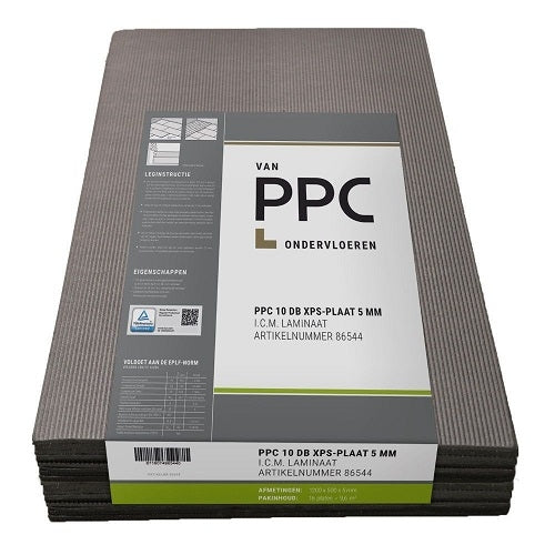XPS plaat 5 mm is een 10db TÜV gecertificeerde geluidsreducerende zeer stabiele en druk vaste egaliserende ondervloer voor laminaat die voldoen aan de EPLF-norm.