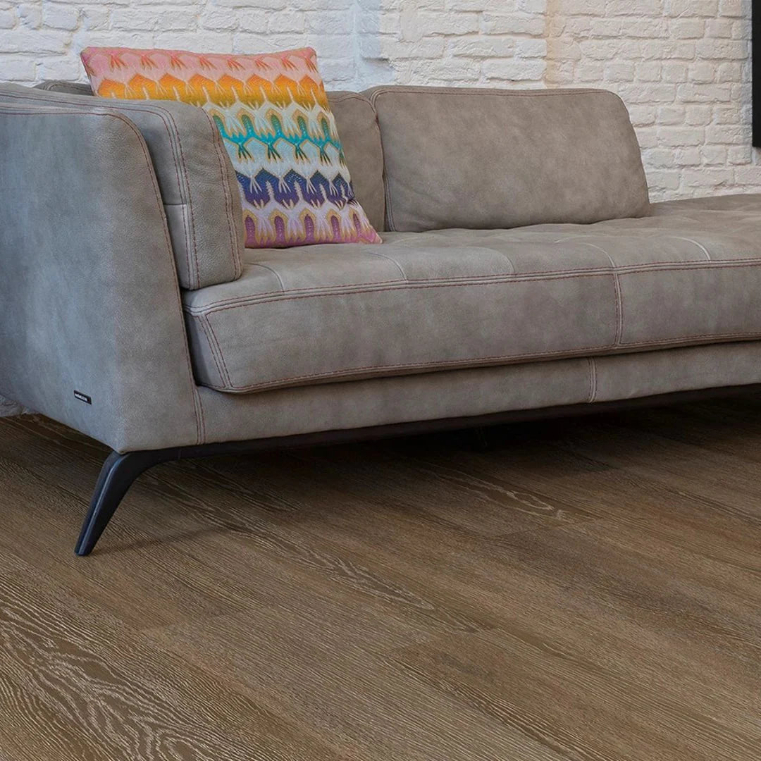 Het eerste wat u ziet als deze vloer in huis ligt, is de verbluffend realistische houtnerf. Met de geavanceerde Embossed in Register (EIR) technologie van COREtec wordt de structuur van echt hout minutieus nagemaakt, tot in de kleinste details. Elke plank heeft een subtiele Micro 4V-rand, waardoor het vloeroppervlak diepte en karakter krijgt. De grijze-bruine tint past naadloos bij moderne, klassieke en industriële interieurs – u creëert direct een warme, stoere basis waar elk meubelstuk tot zijn recht komt.