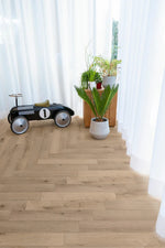 De COREtec Authentics Herringbone 140 Nimbus is een stijlvolle visgraat PVC vloer die elegantie en modern comfort combineert. Met een paneelformaat van 66 x 11 cm en een dikte van 8 mm creëert u een verfijnde vloer met een authentiek visgraatpatroon. Dankzij het kliksysteem is de installatie eenvoudig en snel, zonder lijm. De vloer is volledig waterbestendig en geschikt voor vloerverwarming, waardoor hij ideaal is voor iedere woonruimte. Met Micro 4V-groeven voor een realistisch effect en 15 jaar garantie geniet u jarenlang van een duurzame en onderhoudsvriendelijke vloer.