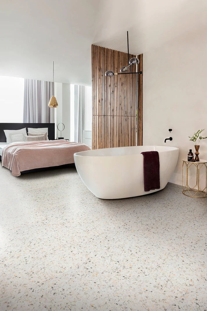 De Floorify Grote Tegel Verona FG023 Plak PVC brengt een moderne terrazzo-look in zachte beige en grijze tinten. Met een groot formaat van 90 x 60 cm creëert deze vloer direct een ruimtelijk effect, ideaal voor zowel moderne appartementen als ruime gezinswoningen.